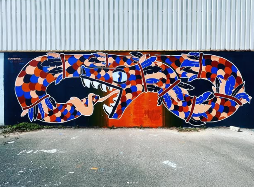 Angélique, âme poétique et engagée, tisse ses rêves à partir de matériaux récupérés, carton, papier mâché, fibres naturelles, conférant une seconde vie à l’objet, à l’éphémère. Ensemble, ils construisent des fresques murales mêlant peinture, graffiti et poésie, pour habiter nos villes de visions nouvelles et portées par l’imagination.